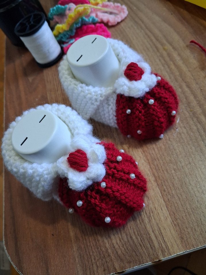 renkli kırmızı detaylar ve inci süslemeleriyle beyaz örgü kız bebek patikleri, klasik bir tarza sahiptir.