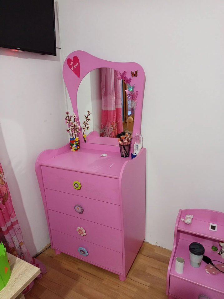 Dört çekmeceli, renkli çiçek kulplu ve kelebek çıkartmalı büyük aynası olan pastel pembe çocuk şifonyeri.