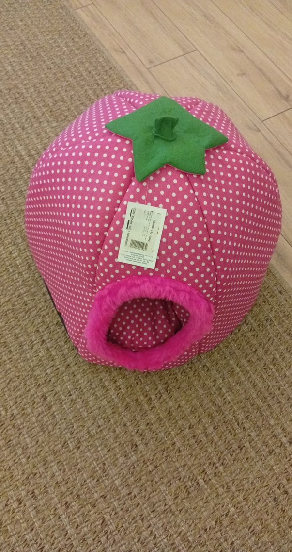 Pembe puantiyeli, çilek şeklinde yumuşak kumaştan kedi yatağı. Üstte yeşil yaprak detayı ve tüylü, rahat giriş bulunur. içerisinde doldun yastığı bulunmaktadır.Hiç kullanılmadı üzerinde etiketi mevcut.