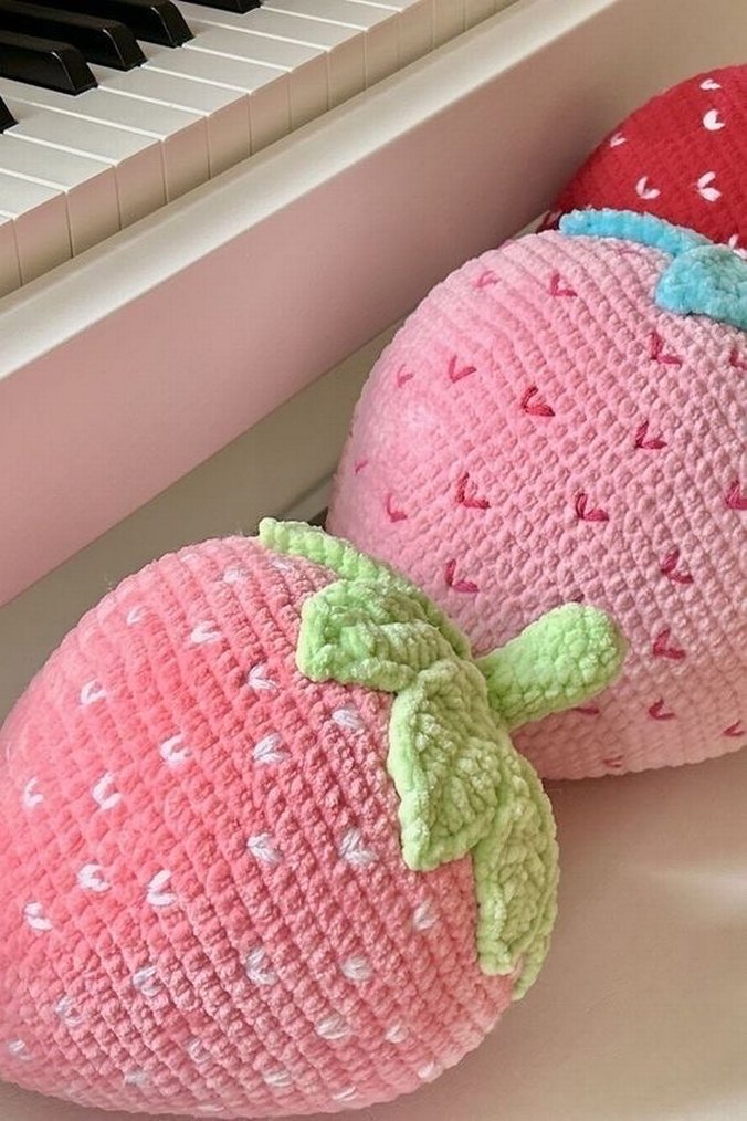 Yumuşak ve renkli pembe çilek şeklinde yastık, dokulu kumaş ve yeşil yaprak detaylarıyla. Dekorasyon veya sarılmak için uygun.