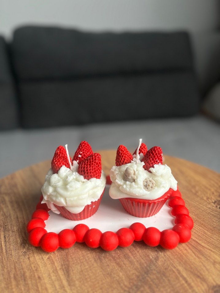 Çilek ve kremalı kek şeklinde, canlı renklerde dekoratif mumlar. Her ortamda neşeli ve dikkat çekici bir hava yaratır. 3 lü set tabak dahildir