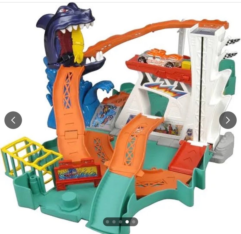 Renkli dinozor figürlü oyuncak yarış seti, arabalar için birden fazla pist ve rampaya sahiptir.