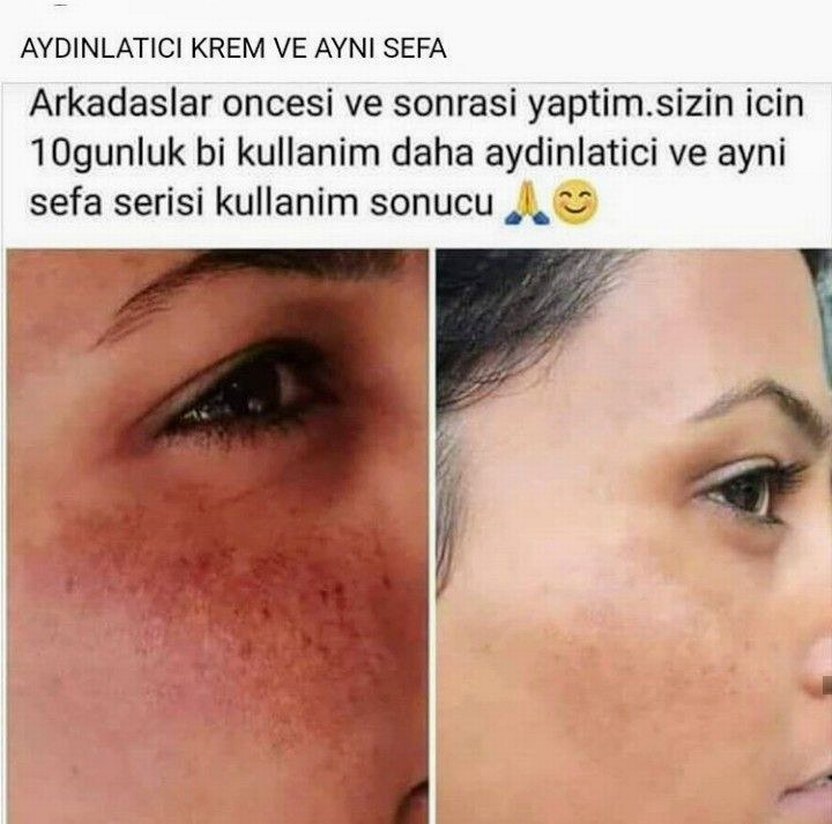 Düzenli kullanımla cildi aydınlatan krem, koyu lekeleri azaltır ve cilt tonunu eşitler. Öncesi ve sonrası fotoğraflarda fark görülür. 7 adet set ürünü..