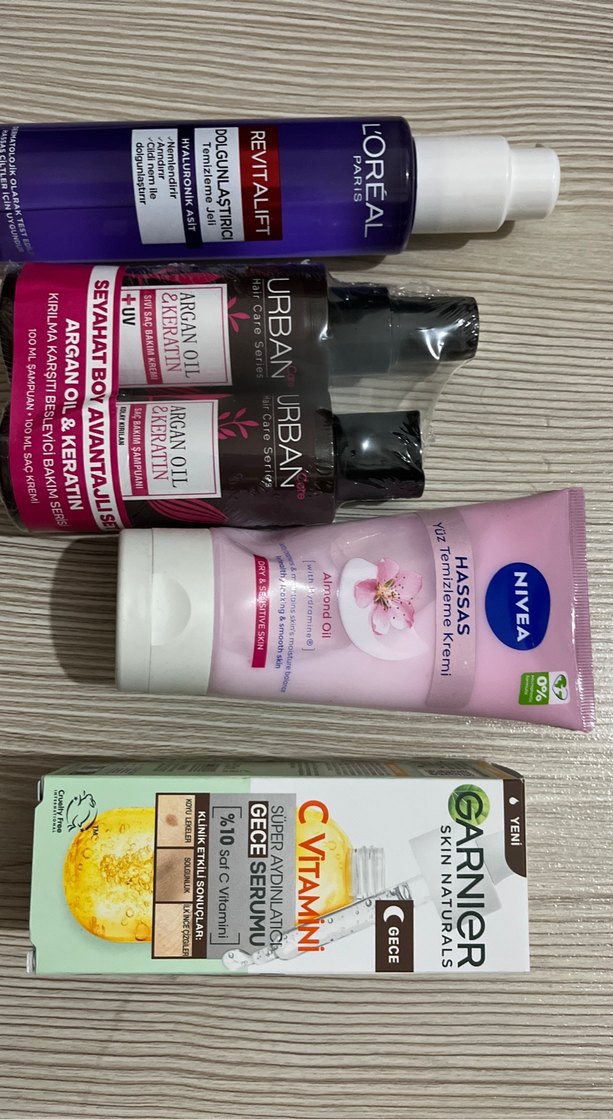 Set, L'Oreal Revitalift gece serumu, Urban Argan Oil & Keratin serumu, Nivea hassas el kremi ve Garnier C Vitamini gece serumu içerir. Cilt besler ve yeniler.