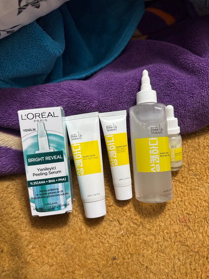 L'Oréal Bright Reveal Peeling Serum, %2.5 AHA, BHA ve PHA ile cildi yeniler. Ek olarak küçük tüpler ve serum şişesi içerir.✨
