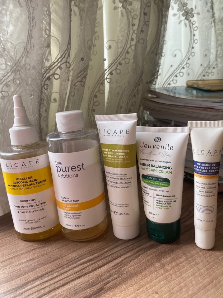 Cilt tonu eşitleyici ve nemlendirici özelliklere sahip micellar glikolik asit peeling toniği, eksfoliye serum, günlük bakım kremi ve vitamin C göz kreminden oluşan cilt bakım seti.