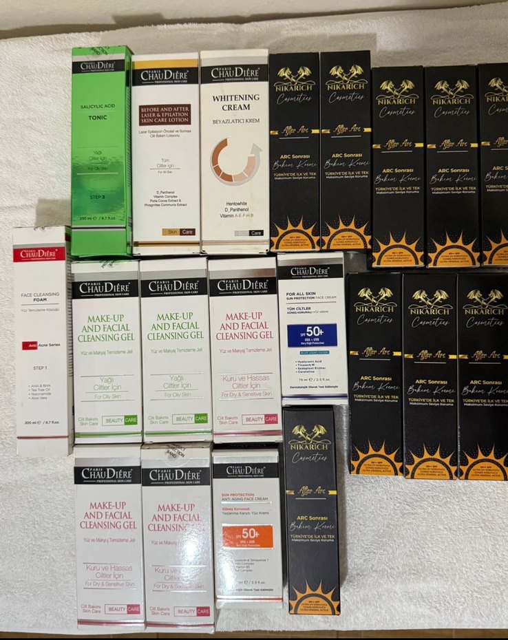 Makyaj ve yüz temizleme jelleri, beyazlatıcı krem, tonik ve SPF 50+ güneş koruyucu kremler içeren cilt bakım ürünleri seti. Yüz temizliği, cilt aydınlatma ve güneş koruma sağlar. ☀️ adet 750 tl