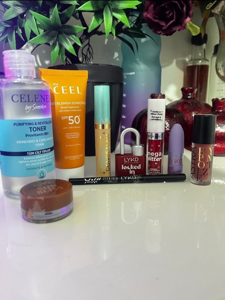 SPF 50 güneş kremi ve çeşitli makyaj malzemeleri bulunur.