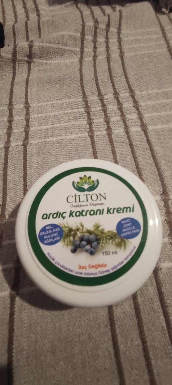 Cilton markasına ait 150 ml ardıç katranı kremi, eklem, kas ve kemik ağrılarını hafifletir. İlaç değildir. çok faydasını gördüm tavsiye ederim içindekiler ardıç katranı özü, kekik yağı, zencefil, At kuyruğu diye yazıyor