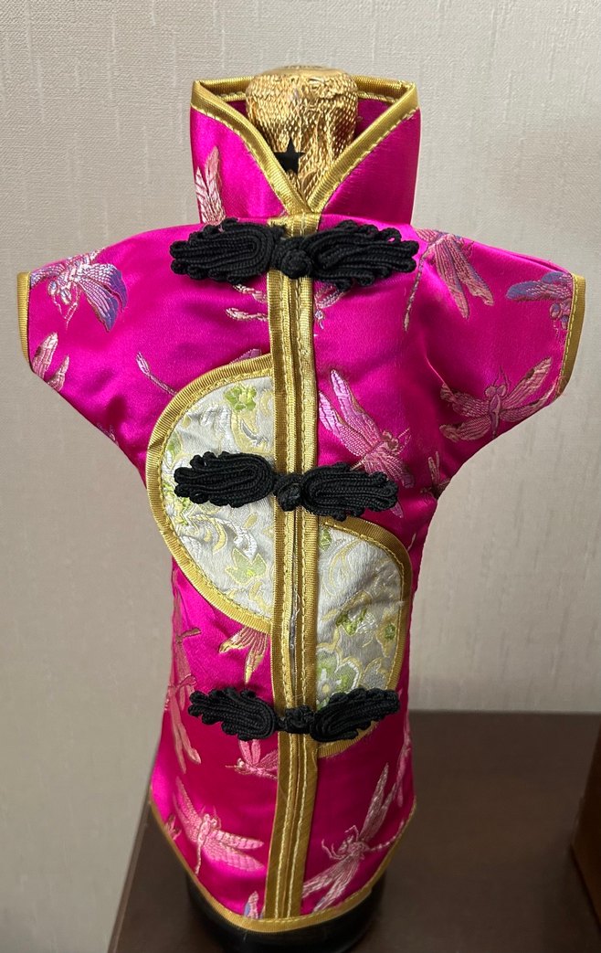 Çin ipeği, pembe desenli, kimono, dekoratif, şile kılıfı, Çin’den alındı, tüm şişelere uyumlu, boy:29cm, en:13cm, çap:26cm, en üst kısım çapı15cm, defosu yoktur