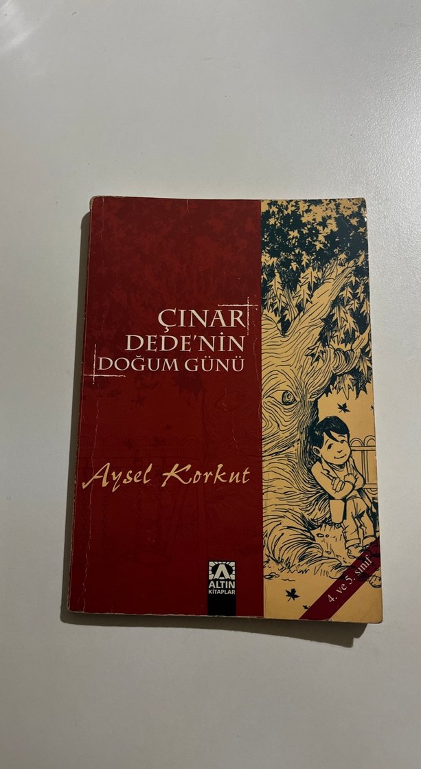 Ayşet Korkut'un "Çınar Dede'nin Doğum Günü" adlı romanı, bir çocuğun çınar ağacının altında oturduğu nostaljik kapak tasarımıyla.