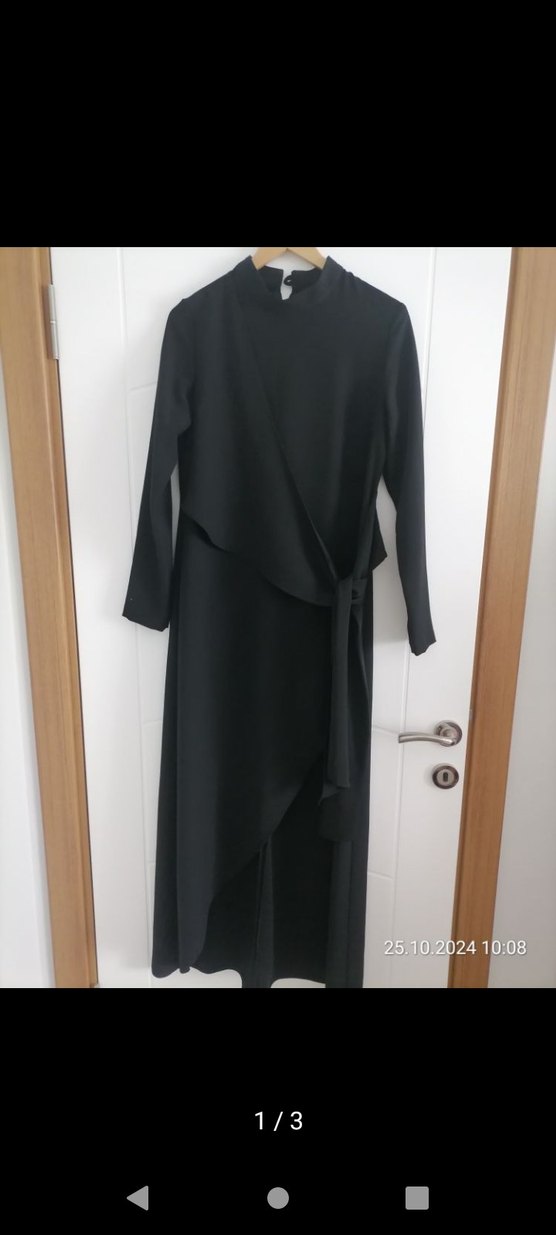 Siyah uzun kollu, yüksek yakalı, drapeli tasarıma sahip, sentetik kumaştan yapılmış, minimalist ve çağdaş stil elbise. Ofis kullanımı için uygun, rahat kesim.