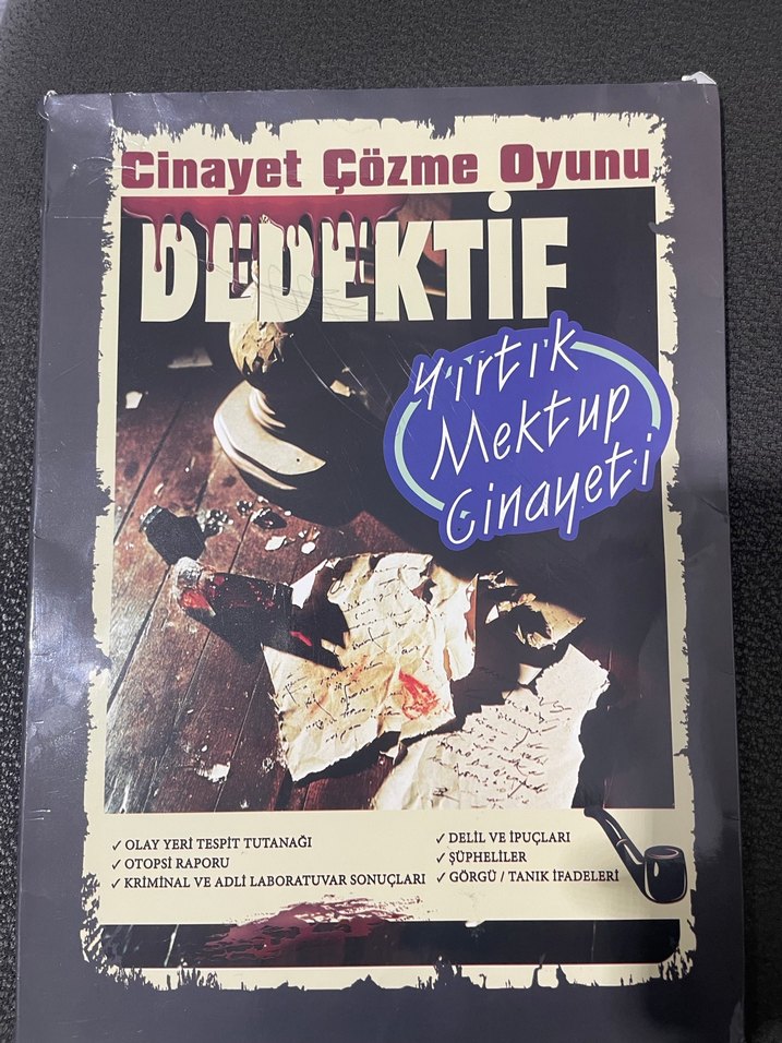 Cinayet çözme oyunu kitabı; yırtık mektup cinayeti, olay yeri tutanakları, deliller ve şüpheli ifadeleri içerir. ️♂️