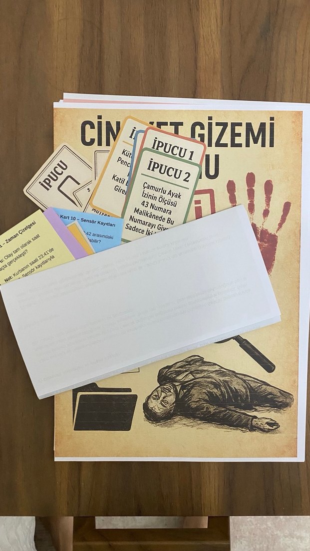 Cinayet gizemi oyununda katili bulmaya çalışın. Suç mahalli, büyüteç ve şüpheli çizimi içeren bir dedektif oyunu. OLAY SENARYOSU – “Malikhane’de Gece Yarısı” Oyun içeriği Olay örgüsü Bulgular Şüpheliler Otopsi raporu (görselle zenginleştirilmiş) Tanık ifadeleri Telefon kayıtları İpuçları Ve oyun sonunda açılmak üzere gizemli olayın katil dosyası…