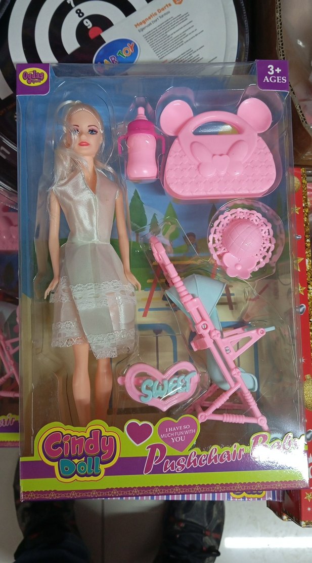 Cindy bebek setinde beyaz elbiseli açık renkli bebek, pembe puset, biberon, çanta, şapka ve kalp şeklinde aksesuar bulunur. 3 yaş ve üzeri için uygundur.