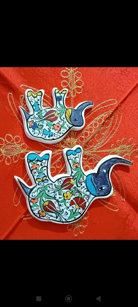 15*10 cm ve 9*7 cm fil çini 2 li süs.seramik. Asma yeri yok. Kusursuz. İkilidir. Tek satılmaz. Fotolardaki gibidir. Fotoğrafları inceleyiniz.emin değilseniz alım yapmayınız. iptal iade yok.
