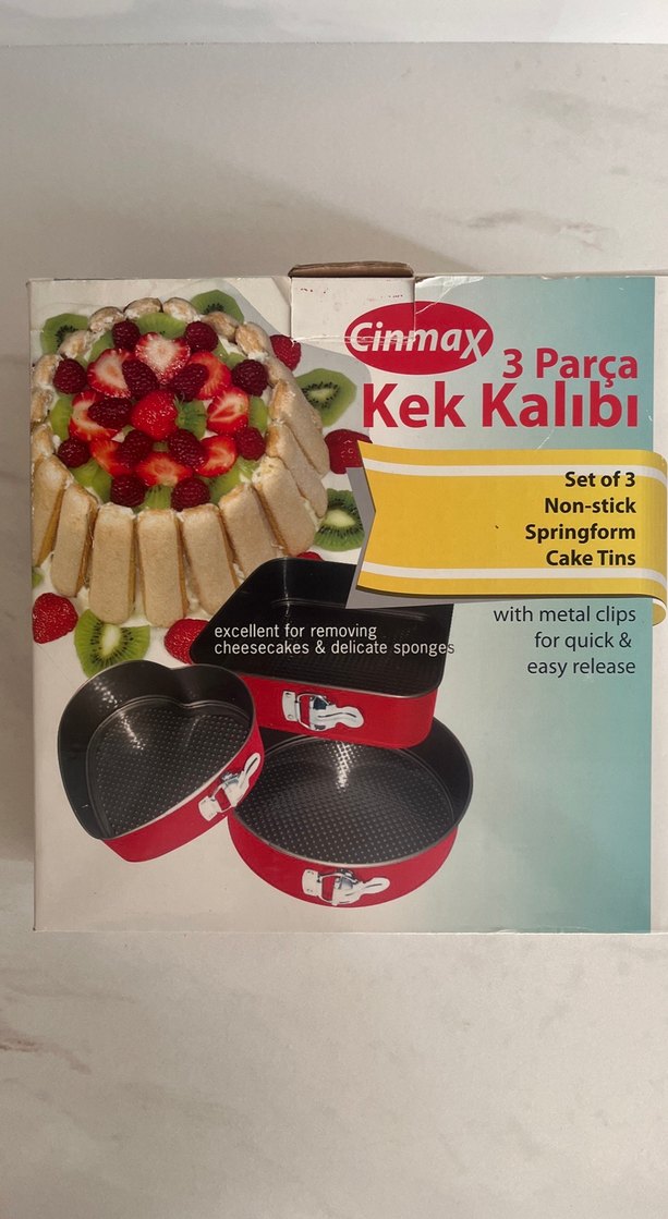 Cinmax marka, metal klipsli, yapışmaz kaplamalı kırmızı 3 parça kek kalıbı seti. Cheesecake ve hassas kekler için uygundur.