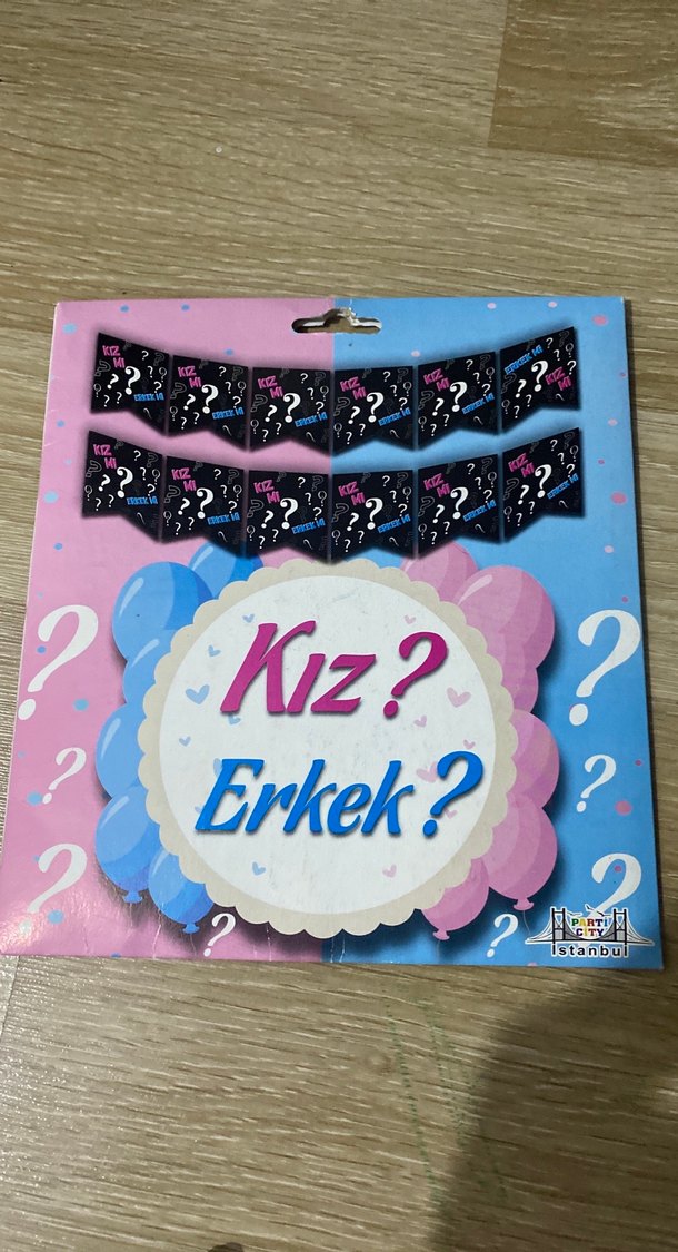 Koyu pembe ve mavi renklerde, "Kız?" ve "Erkek?" yazılı cinsiyet belirleme partisi süsleri. Üzerinde soru işaretleri bulunan afiş seti.