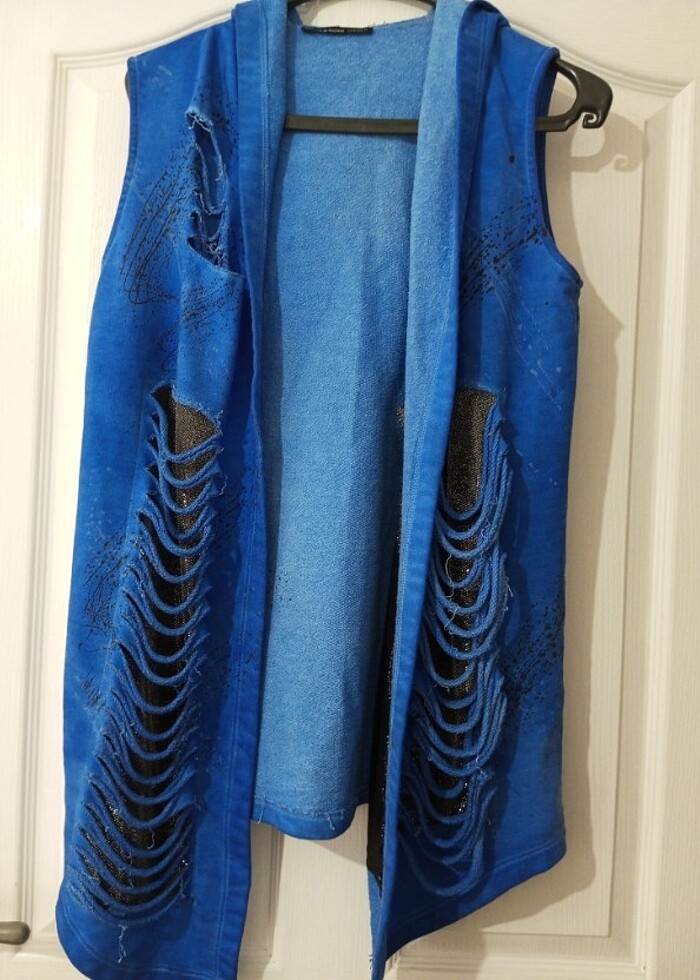 Ürün köyü saks mavi M - beden yırtık model simetri kesimli arka kısa ön uzun pamuklu kapüşonlu yelek tarzı switshort Şık gece ve gündüz giyilebilir
