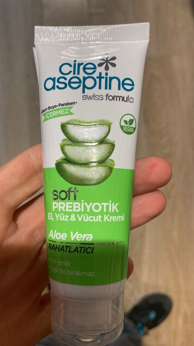 Cire Aseptine Aloe Vera içeren, rahatlatıcı yumuşak prebiyotik krem. Hızlı emilir, yapışkan his bırakmaz. El, yüz ve vücut için uygundur. Vegan formül.