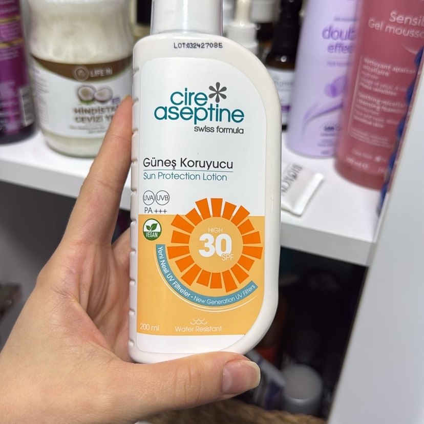 Cire Aseptine güneş koruyucu losyon, SPF 30 ve PA+++ koruma sağlar. Suya dayanıklı, UVA ve UVB ışınlarına karşı korur. Vegan ve 200 ml.