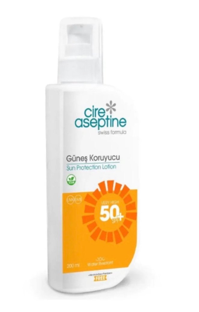 Cire Aseptine Güneş Koruyucu Losyon, SPF 50+ ile cildi güneşin zararlı ışınlarından korur. 200 ml pompalı şişede, Swiss formül ile sunulur. ☀️