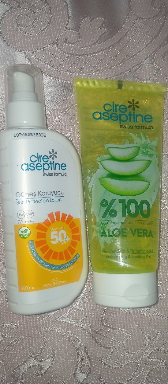 Cire Aseptine güneş koruyucu losyon SPF 50 ile geniş UVA/UVB koruması ve suya dayanıklılık sağlar. Aloe vera jeli %100 doğal nemlendirme ve yatıştırıcı etki sunar. ikisi yeni kullanılmamış