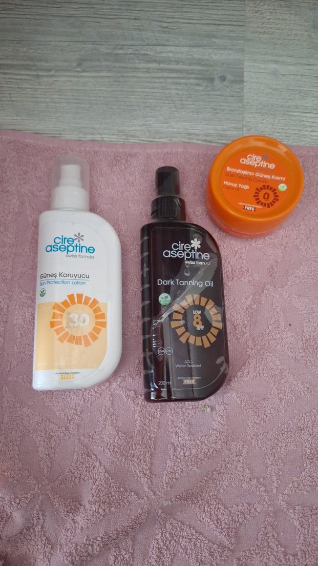 adet fiyatı 150 devamı vardır.......Cire Aseptine güneş koruyucu losyon SPF 30, koyu bronzlaştırıcı yağ SPF 8 ve bronzlaştırıcı krem içerir.