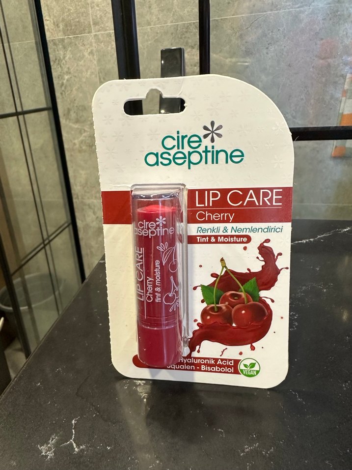 Cire Aseptine Kiraz renkli dudak bakım çubuğu, hyaluronik asit ve bisabolol ile nem ve renk sağlar.