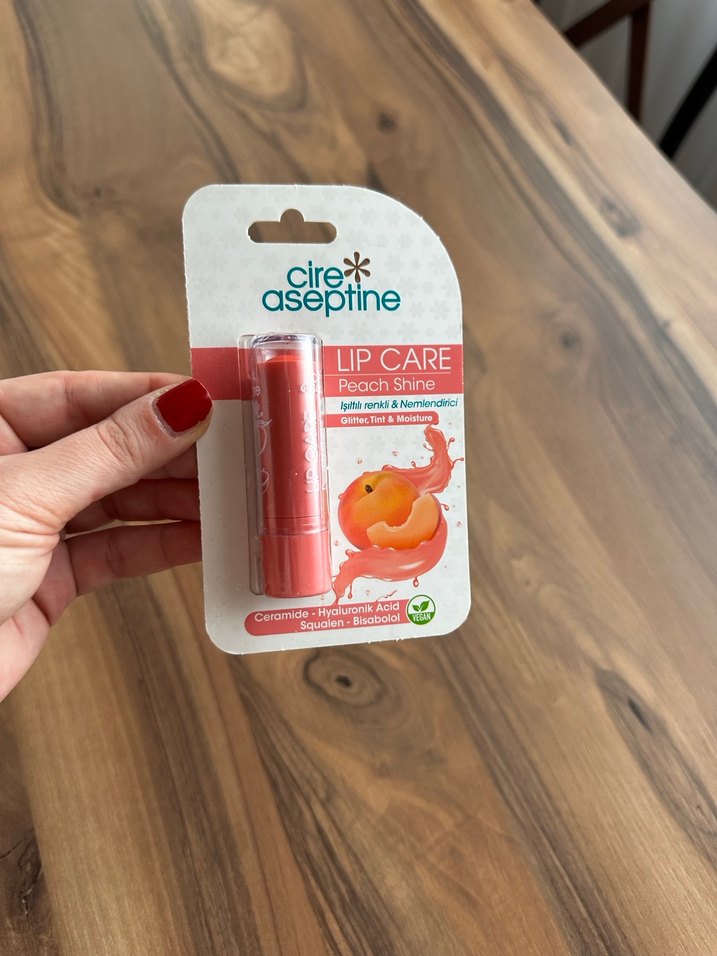 Cire Aseptine şeftali parlaklığı sağlayan pastel turuncu dudak bakım ürünü, nemlendirici ve besleyici özellikler içerir.