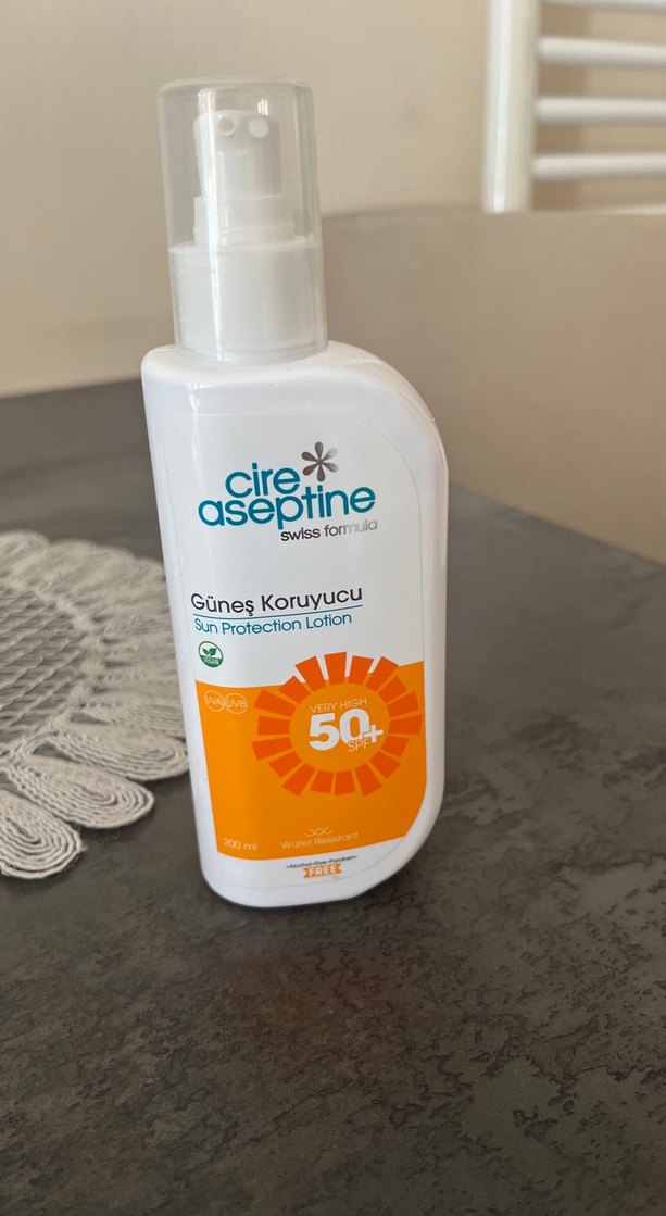 Cire Aseptine Güneş Koruyucu Losyon, çok yüksek koruma sağlayan SPF 50+ faktörlü 200 ml sprey formundadır. Cildinizi güneşin zararlı ışınlarından korur.