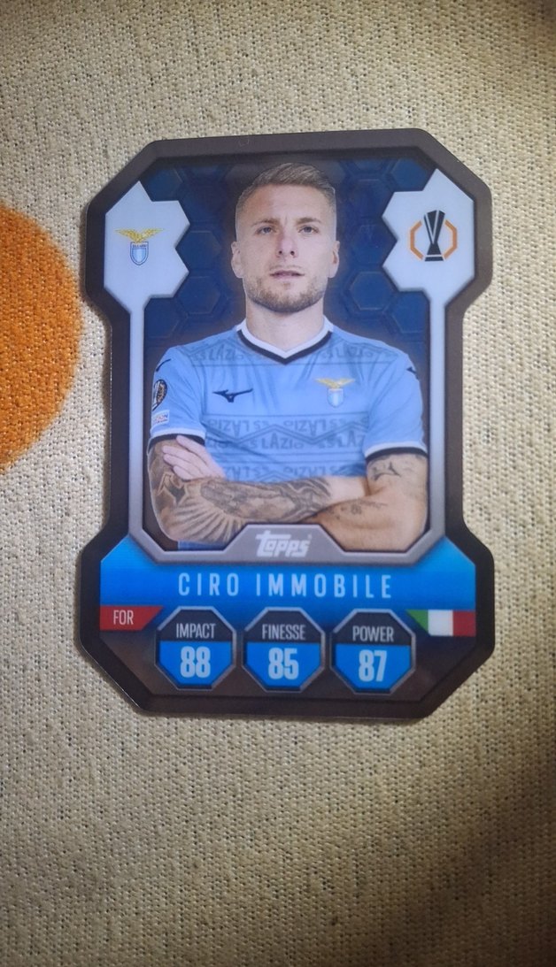 Bu mavi futbol kartında Ciro Immobile yer alıyor. Etki, beceri ve güç puanları ile Topps ve UEFA logosu mevcut. ⚽
