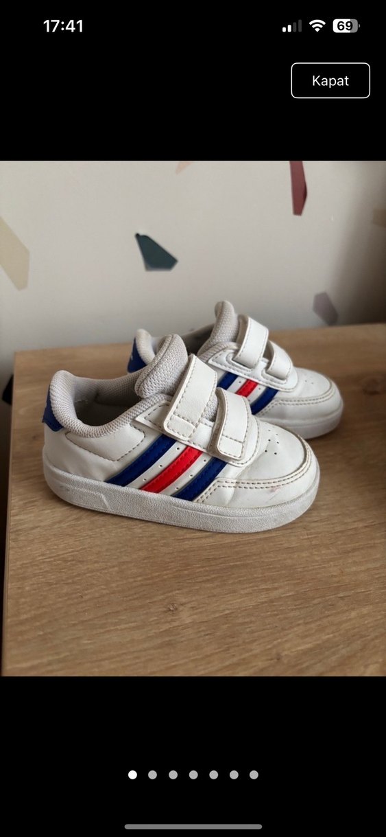 Cırt cırtlı beyaz erkek çocuk spor ayakkabısı, mavi ve kırmızı çizgili desene sahip. Dayanıklı kauçuk tabanlı, trend günlük stile uygun.