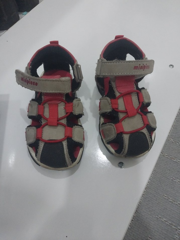 Kırmızı ve gri renklerde, cırt cırtlı bantlarla sabitlenen baskılı erkek çocuk sandaletleri. Dayanıklı kauçuk malzemeden üretilmiştir, sokak stili için uygun. Tamamen hakiki deridir. kalıbı büyük.