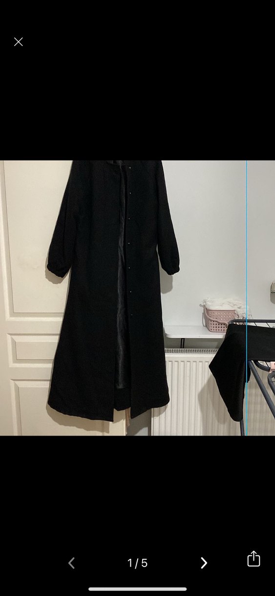Düğmeli ve yakalı uzun siyah kaban, bol kesim ve uzun kollu, yumuşak ve sıcak kumaştan. Ofis kullanımı için uygun. Lemayenin ürünü