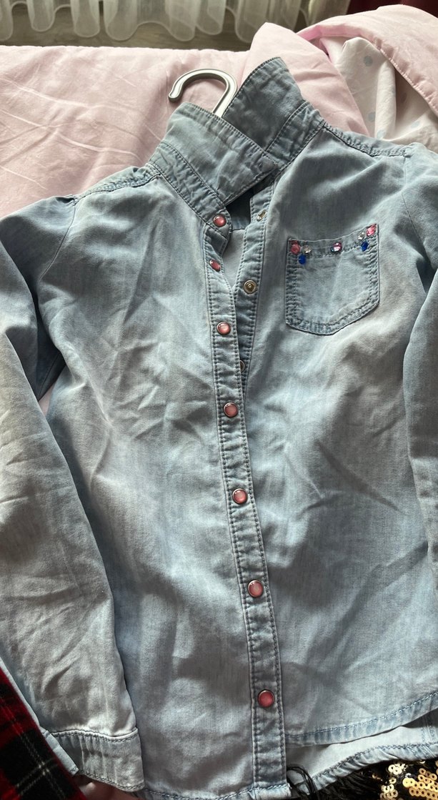 uzun kollu, kesimli denim gömlek taş detaylı renkli çoçuk gömlek günlük kullanıma uygun rahat stil.