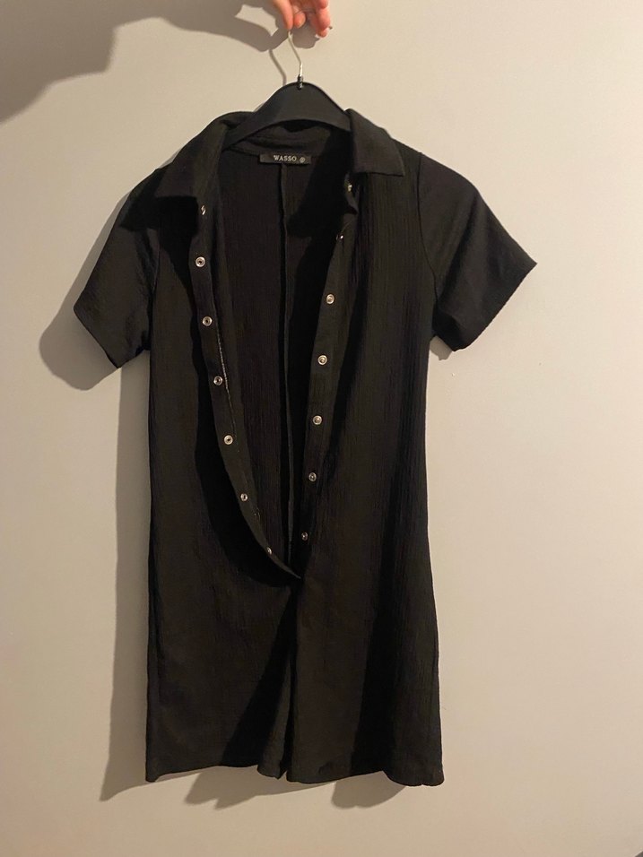 Kısa kollu, yakalı ve siyah tulum, günlük rahat kullanım için uygun, vücuda oturan kesimde.
