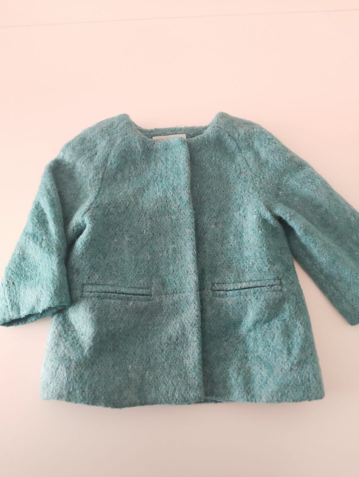 Turkuaz renkli, düğmeli, uzun kollu, notalı yakalı yün hamile kabanı. Rahat kesimi ve yumuşak dokusuyla günlük kullanıma uygundur. zara 12/ 18 ay defosu yoktur