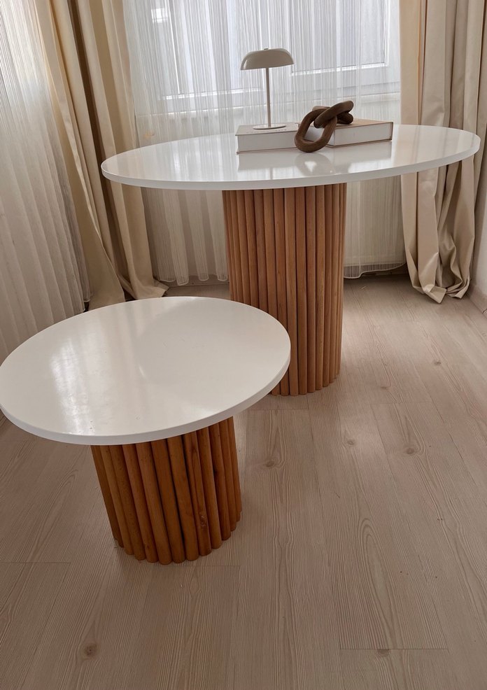 İkili satacağım.. Ahşap silindir tabanlı, beyaz yüzeyli çocuk oyun masası ve sandalyesi seti. Doğal ahşap dokusu ve pürüzsüz beyaz yüzeyler bir arada.