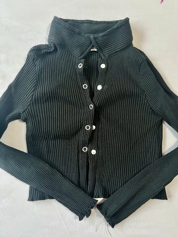 Düğmeli, yakalı ve uzun kollu bu siyah triko kazak, günlük kullanım için gotik tarzda şık ve sade bir görünüm sunar.