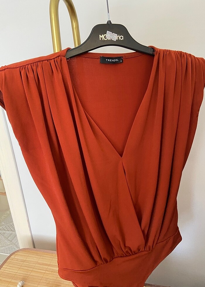 Kiremit rengi Vatkalı kruvaze yaka esnek çıtçıtlı örme body