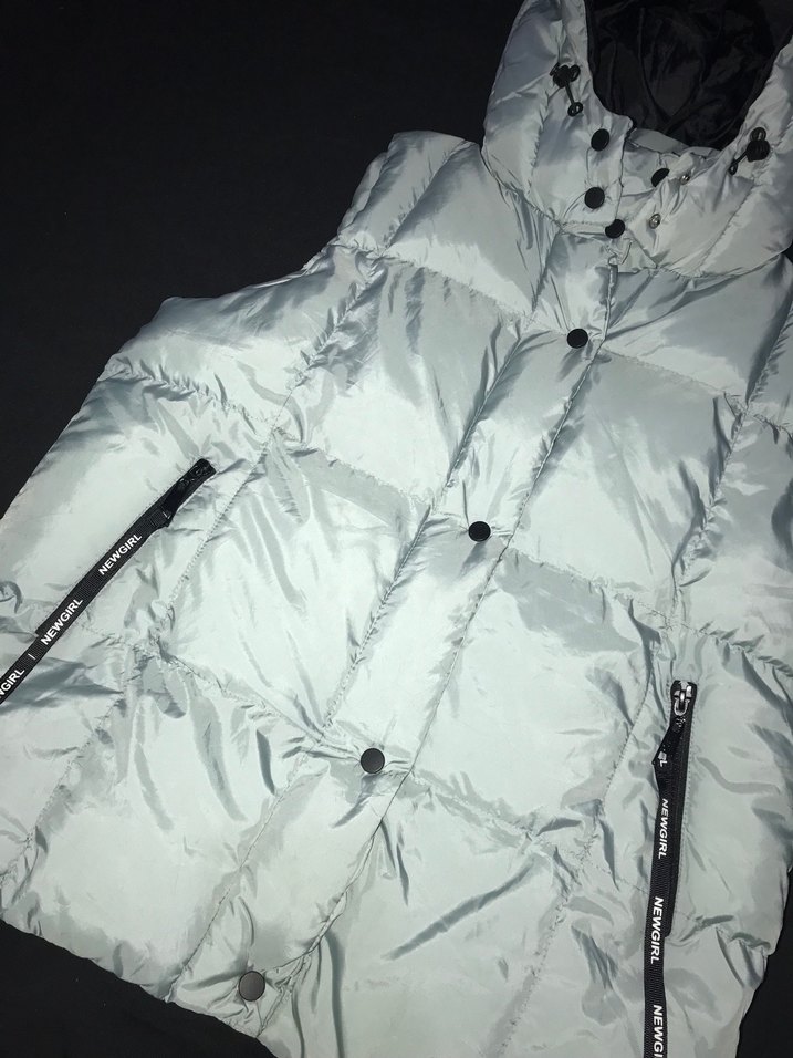 Çıtçıtlı, yüksek yakalı, mavi kadın şişme yelek. Sentetik kumaştan yapılmış, kolsuz, midi boy ve dar kesim. Açık hava için uygundur. 1 defa kullanıldı