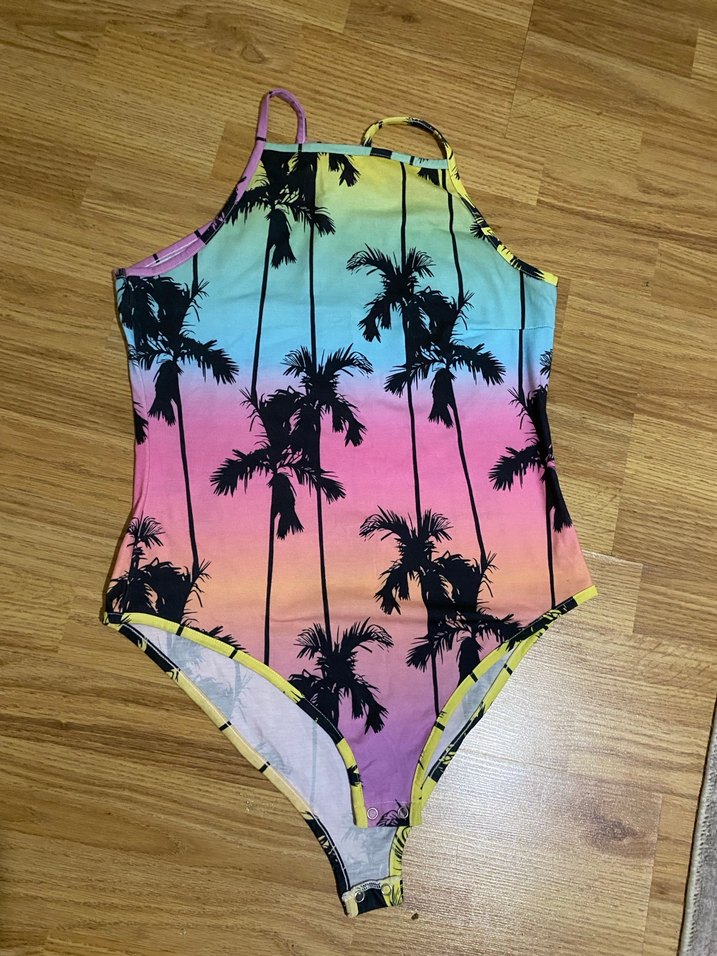 Bu sıkı kesim kadın mayosu, pastel renkli bağlamalı desen ve palmiyelerle, bağlamalı dantel detaylara sahip, plaj için uygun.