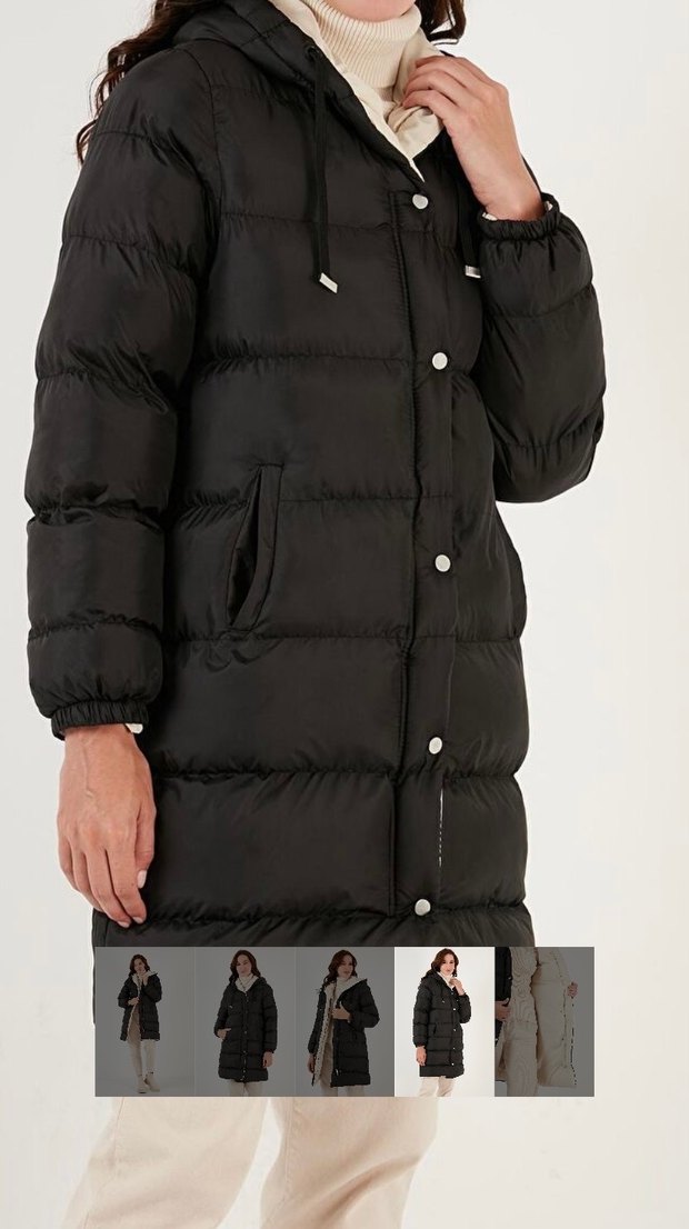 Düğmeli, siyah kadın kışlık mont, midi boy ve uzun kolludur. Rahat ve sıcak dokusu, sokak stiline uygun şık bir görünüme sahiptir. Lc Waikiki den alınmıştır Markastok/ Lela