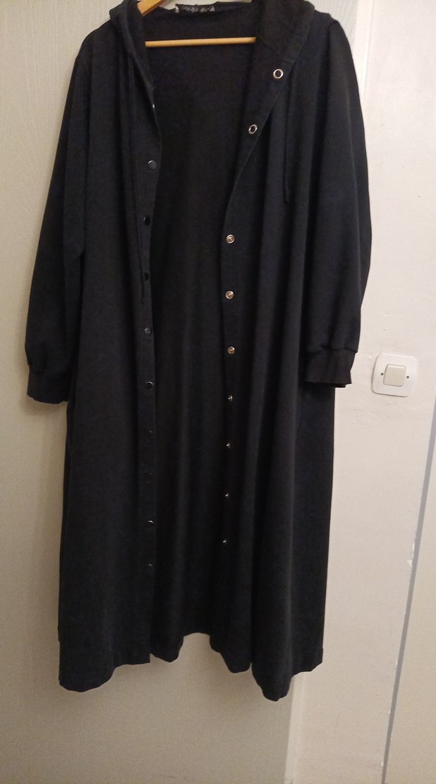 Düğmeli, siyah uzun kadın kaban, geniş kesim, yaka detaylı ve uzun kolludur. Yumuşak ve sıcak kumaştan yapılmıştır, günlük kullanıma uygundur.