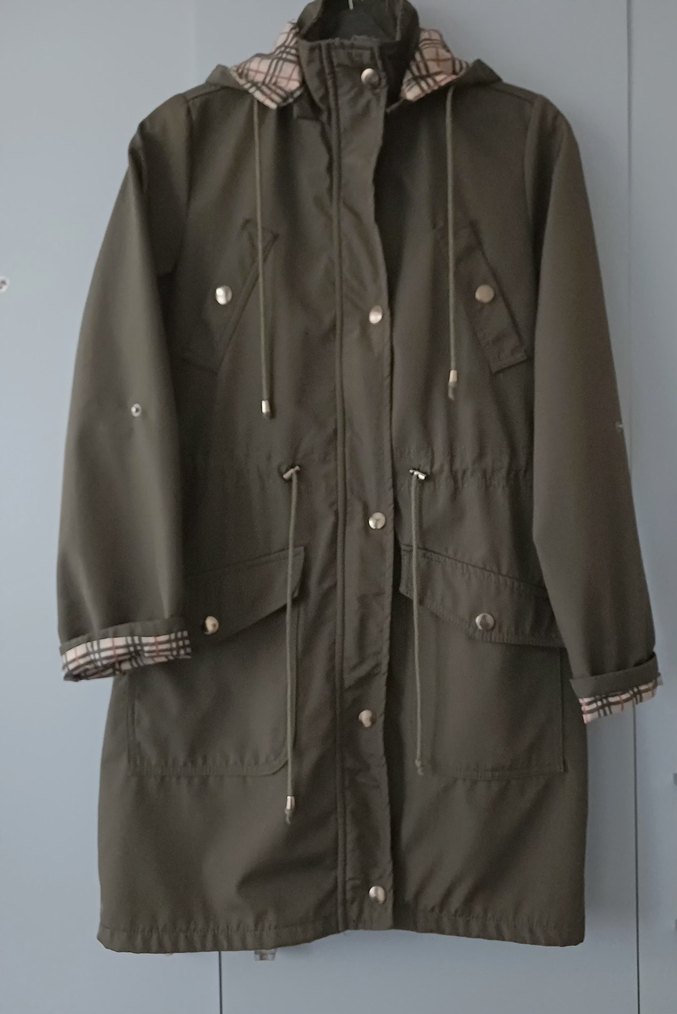 Kadın midi uzunlukta, çıtçıtlı ve fermuarlı trençkot. Notch yaka ve uzun kollu, sentetik kumaştan, günlük sokak tarzına uygun haki renkte.