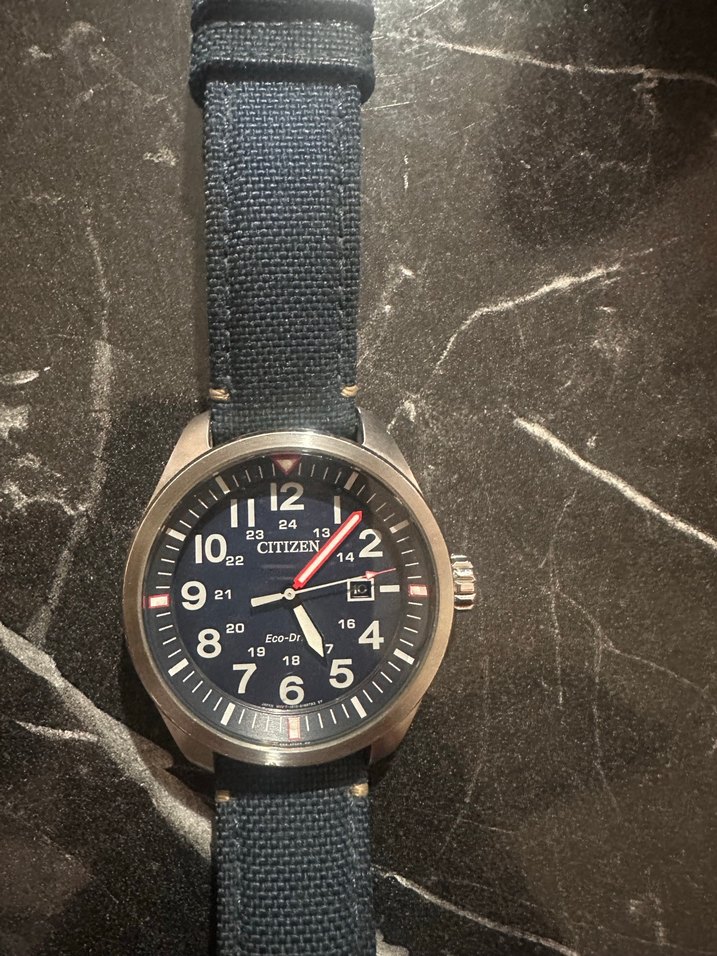 Citizen erkek saat, koyu mavi kumaş kayış ve net rakamlı klasik kadran ile. Tarih göstergesi ve kırmızı saniye kolu bulunur. ⌚çalışır vaziyettedir.hiçbir sorunu yoktur.