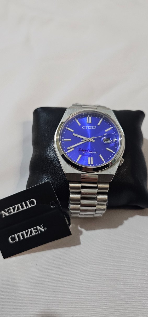Citizen marka, otomatik mekanizmalı klasik erkek saati. Canlı mavi kadran ve gümüş metal bilezik içerir, tarih göstergelidir. ⌚