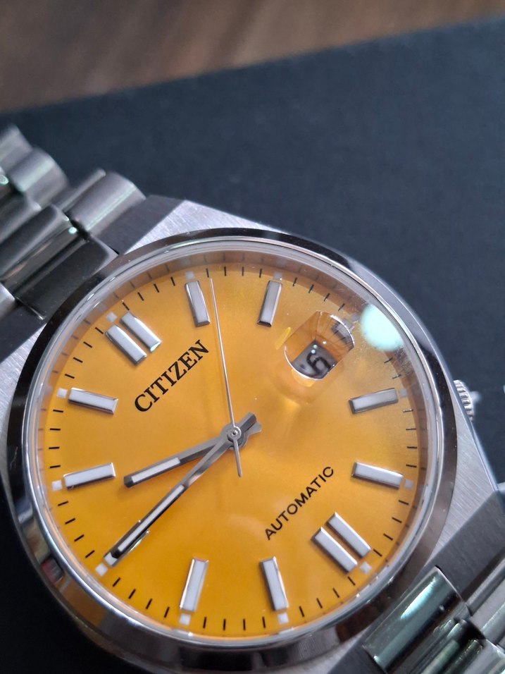 Citizen markalı erkek saatte renkli sarı kadran, otomatik mekanizma ve büyüteçli tarih göstergesi bulunur. Kasa ve bilezik paslanmaz çeliktendir. orijinal replik mi sormayiniz Almanya'dan getirdim sıfır temizlikte senelerce kullanilir⌚