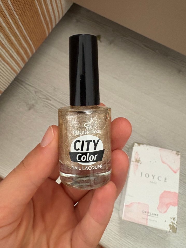 CITY Color açık bej tonunda, hafif ışıltılı tırnak cilası. Şişesi siyah kapaklı ve net etiketlidir.